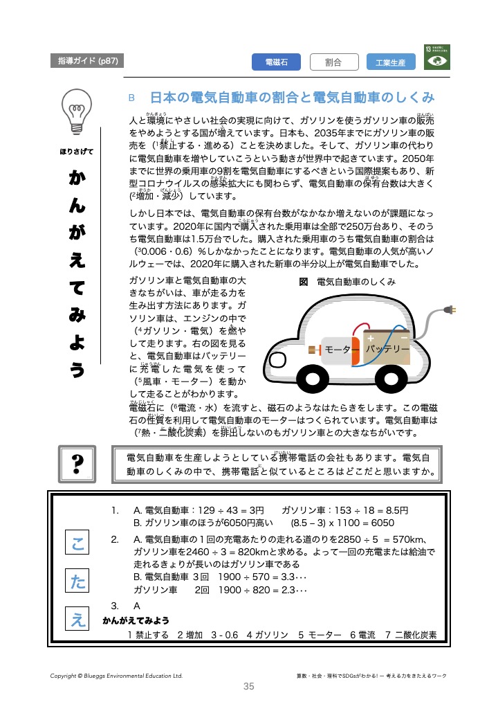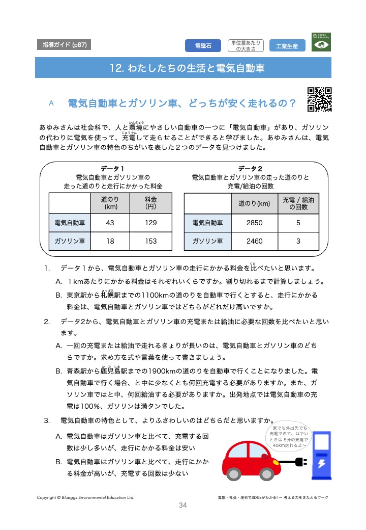 練習問題A ガソリン車/電気自動車 クイズ SDGs 13などの解説が収録されています